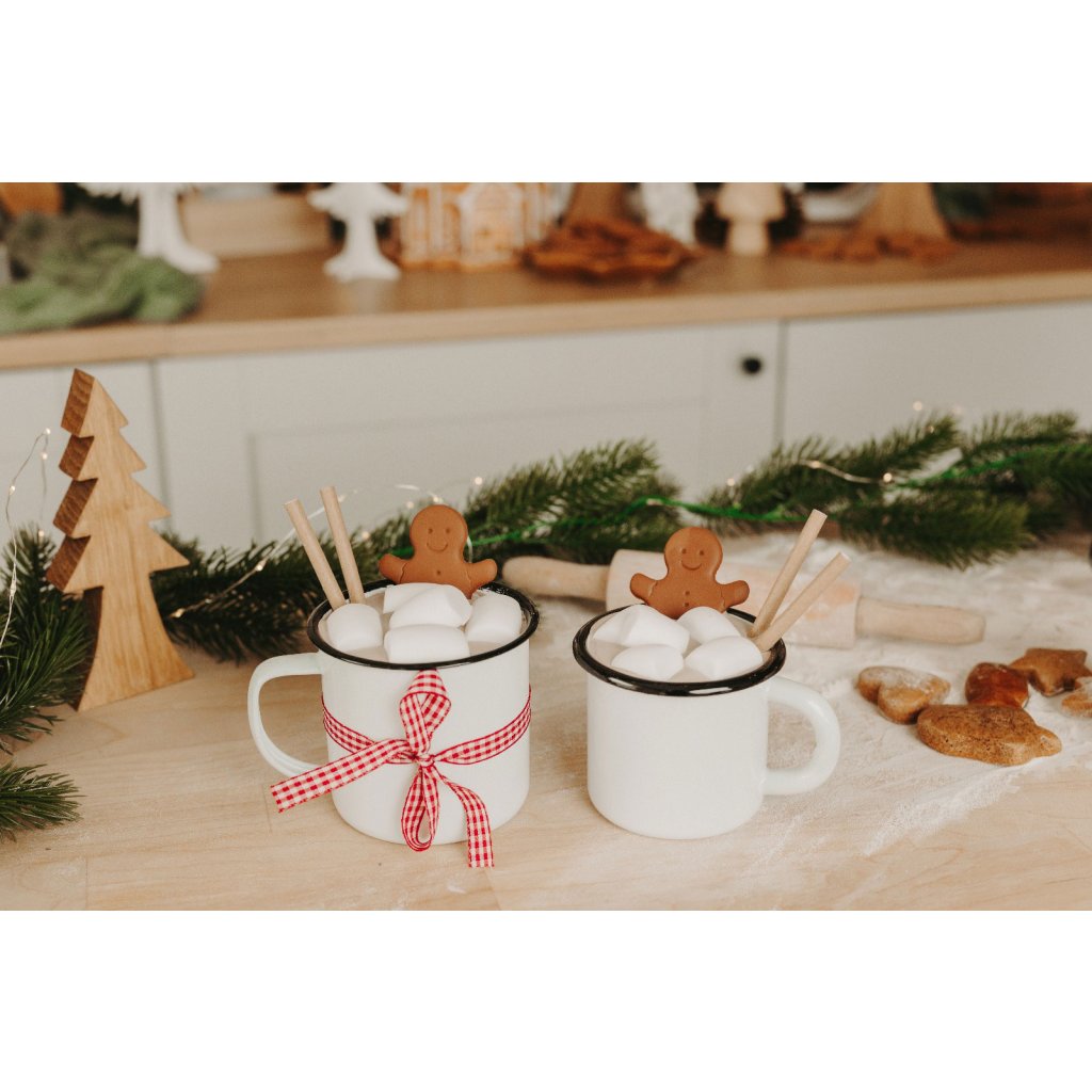 - Plechový bílý hrníček zdobený falešnými marshmallow a perníčkem
